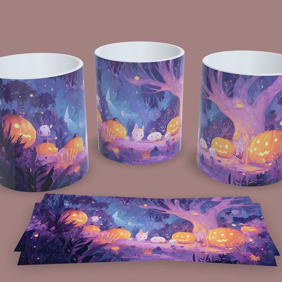 Esta taza de 11 Oz captura la belleza de un bosque iluminado por calabazas sonrientes, donde pequeños seres encantadores celebran Halloween bajo la luna. Ideal para quienes disfrutan de los diseños tiernos con un toque de fantasía otoñal.