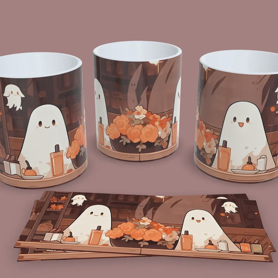 Esta taza de 11 Oz presenta a dos simpáticos fantasmitas compartiendo un momento acogedor entre flores y luces otoñales. Perfecta para quienes aman el espíritu de Halloween con un toque dulce y encantador.